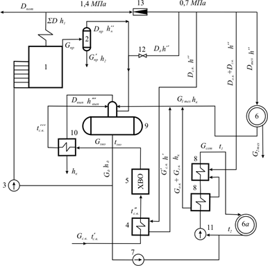 1 – котел; 2 – расширитель непрерывной продувки; 3 - питательный насос; 4 – подогреватель сырой воды; 5 – химводоочистка; 6 – потребитель технологического пара; 6а – потребитель теплоты, используемой на отопление, вентиляцию и горячее водоснабжение;7 – насос для подпитки тепловых сетей; 8 – теплообменники для сетевой воды; 9 – деаэратор атмосферный; 10 – охладитель выпара из деаэратора; 11 – сетевой насос; 12 – регулируемый клапан; 13 – редукционный клапан.