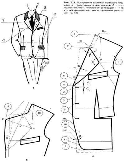 Открытая застежка с лацканом имеет специальное построение. Лацкан сначала строят в отогнутом виде как на рисунке модели, основываясь на оценки пропорции между длиной и шириной лацкана, шириной лацкана и расстоянием от его края до линии проймы и т.д. Последовательность построения лацкана и линии борта показана на примере застежки мужского пиджака (рис.2.3) нумерацией выполняемых операций. Последовательностью предусмотрен контрольный пункт 6 для оценки угла раскрытия застежки и уровня его вершины К в точке пересечения линии сгиба лацкана с линией полузаноса. Если при построении обнаружено несоответствие этих параметров рисунку модели, необходимо пересмотреть принятые значения ширины борта, уровня верхней петли и высоты стойки воротника. Положение линии раскепа на сгибе лацкана определяется от линии талии с использованием масштаба. Точка раскепа М при этом может оказаться выше ил ниже исходной горловины. Направление раскепа устанавливают с помощью натурального значения угла ß на рисунке модели. Окончательная оценка размеров и конфигурации построенного лацкана производится с точки зрения композиционного решения полочки. Симметричное отображение лацкана относительно линии его сгиба при ручном конструировании может выполняться различными способами (способ шаблонов, перпендикуляров, перегиба чертежа и копирование резцом нужных линий).
