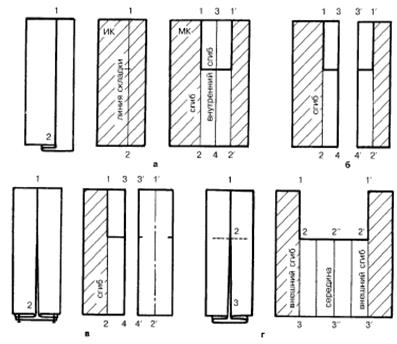Рис.2.4 Проектирование складок: а- внешний вид детали, подготовка шаблона и конструкция детали с односторонней складкой; б- конструкция деталей, образующих разрезную одностороннюю складку или шлицу; в- внешний вид встречной складки со швами по внутренним сгибам и конструкция делатей (основная и отрезная деталь под складку); г- внешний вид и конструкция детали с закреплением складки отделочной поперечной строчкой
