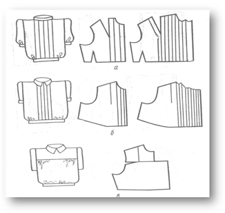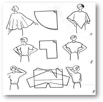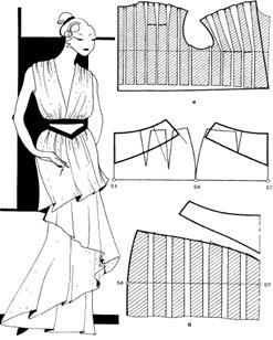 В изделиях свободной формы фалды на полочках и спинке начинают ниже наиболее выступающих точек груди и лопаток. Для получения фалд на спинке закрывают раствор плечевой вытачки. Если раствора вытачки недостаточно, прибегают к его дополнительному увеличению или к образованию вытачки по срезу проймы. Величина сокращения каждого из срезов не должна превышать 1 см (рис. 4, б).