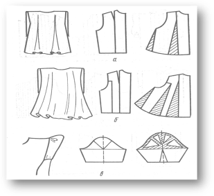 Во избежание нагромождений швов в раствор складки, расположенной вблизи вытачки, включают и раствор вытачки (рис. 3, в). Коническое расширение деталей применяют в том случае, если необходимо добиться увеличения размеров деталей на каком-то определенном участке, излишки ткани на котором затем укладываются в мягкие складки, сборки, драпировки и фалды(рис.4).