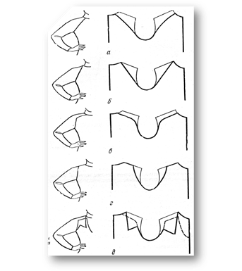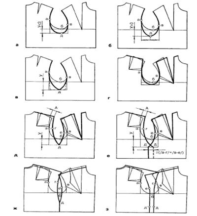 Выпрямление верхних участков проймы при неизменной ширине плечевого ската (рис.5г) является следствием удлинения проймы за счет размоделирования вытачек. На рисунке 5д дан вариант, при котором помимо размоделирования вытачек в конструкции перераспределена общая прибавка по линии груди, в результате чего проймам получается зауженной. В этом случае расширение спинки /а-г/ и полочки /в-е/ необходимо согласовывать с удлинением А плечевого шва для того, чтобы линия проймы пересеклась с линией плеча под прямым углом; при этом как правило расширение полочки /в-е/ меньше аналогичного на спинке /а-г/.