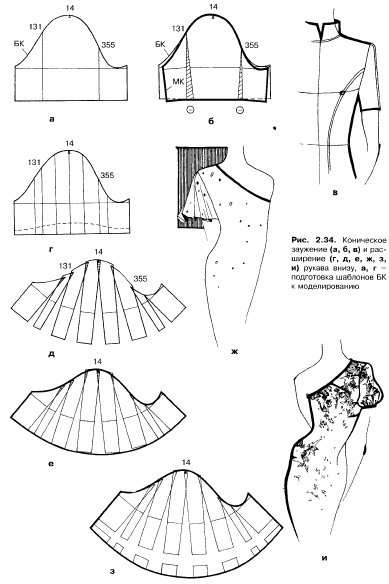 1 – подготовку исходной конструкции, т.е. разделение детали рукава, на части линиями условных членений в места изменения формы (рис.6 а,г; рис.7 б,г,з),