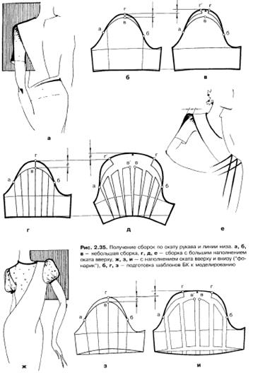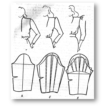 Пластику поверхности регулируют посадкой материала по окату рукава и прибавкой к высоте оката рукава. Для получения рукавов с высоким рельефом оката прибегают к сложному расширению рукава, укладывая излишки материала в сборки, складки, драпировки.
