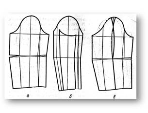1. Небольшое расширение — передняя вытачка переводится полностью, а задняя — частично (на величину раствора передней) (рис. 15, б).