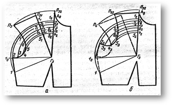Графический метод более сложный, но с его помощью вытачка может быть перенесена без вспомогательного лекала в любой конструктивный или конструктивно-декоративный срез детали. Известно несколько вариантов графического метода, наибольшее распространение из которых получил метод дуг и засечек. (рис.2, а). Особенно широко он применяется, если вытачку необходимо повернуть на некоторый угол, разделить ее на несколько частей, перенести в рельефную линию.