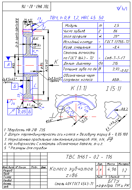 Пример 1. Дано в "сборочной единице" колесо зубчатое черт., ТВС 1Н61—2—116 (рис. 1) с выпуском 4800 деталей в год. Выполнить описание детали.