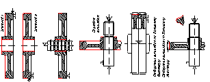 На схеме приводят элементы приспособлений для крепления заготовки (кулачковые или цанговые патроны, центра, установочные и зажимные детали фрезерных приспособлений, кондукторные плиты сверлильных и т.д.) и элементы оборудования (передняя и задняя бабка, шпиндель, суппорт, стол, станина и пр.).