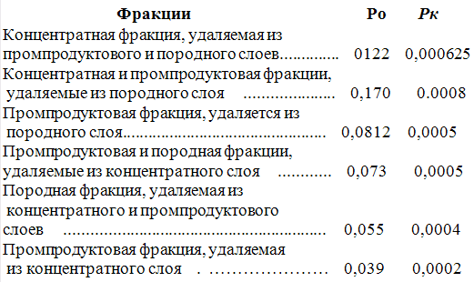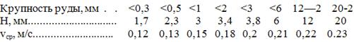Для руд высота слоя материала, расположенного выше сливного порога, и продольная скорость движения этого слоя в зависимости от крупности обогащаемой руды, следующие:
