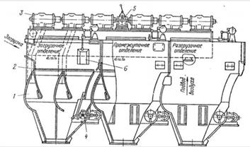 На рис. 3 изображена беспоршневая отсадочная машина ОМ-12. Она состоит из воздушных камер 2, расположенных под отсадочными решетками 2, пульсаторов 3, роторных разгрузчиков 4, коробки скоростей 5 и поплавков б.