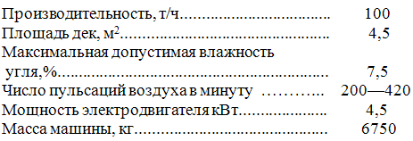 Производительность этих машин по питанию в зависимости от площади отсадки и крупности обогащаемого угля колеблется от 200 до 500 т/ч, а по породе — от 40 до 70 т/ч.
