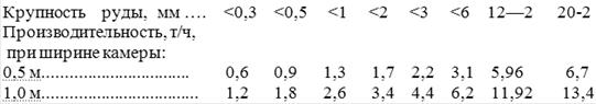Производительность отсадочных машин, вычисляемая по формуле (14), в зависимости от крупности обогащаемого рудного материала и ширины камеры равна: