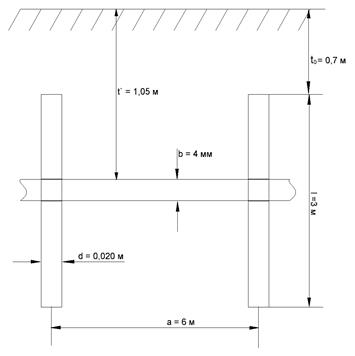 Стальной пруток d = 20 мм, l = 3 м; заземлитель горизонтальный – плоса 40x4 мм; глубина заложения горизонтального заземлителя – 0,7 м; климатическая зона – III; грунт – суглинок.