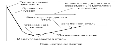 Все современные способы упрочнения металлов (легирование, закалка, прокатка, ковка, штамповка, волочение и т.д.) – это увеличение количества дефектов в металле. Наивысшая прочность, которую можно получить путем увеличения количества дефектов в металле, составляет около 1/3 от теоретически возможной (идеальной) прочности.