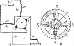 Мал. 2. Принципова електрична схема генератора з розщепленими полюсами (а) і схема магнітних силових полів (б)