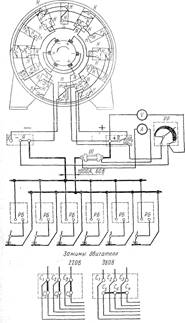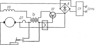 Електрична схема перетворювача ПСГ-500 показана на мал. 5. Обмотка, незалежного збудження харчується від мережі змінного струму через ферорезонансний стабілізатор напруги і блок селенових випрямлячів ВС, що забезпечують постійну, не залежну від коливань напругу мережі , напругу збудження. Напруга на затисках генератора плавно регулюється в межах 15—40 В реостатом Р, включеним послідовно в ланцюг обмотки збудження.