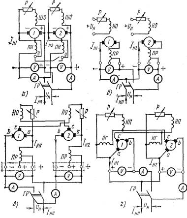 Мал. 7. Схема включення зварювальних генераторів на паралельну роботу: а — багатопостових, б — однопостових з незалежним збудженням і що послідовною розмагнічує обмотками, в — однопостових з паралельною намагнічуючою і послідовною розмагнічуючою обмотками|, г — однопостових з розщепленими полюсами; ШО — шунтова обмотка, ПН| — що послідовна намагнічує, НО — намагнічуюча обмотка, НП| — намагнічуюча поперечних полюсів, ПР— послідовна розмагнічуюча, НГ| — намагнічуюча головних полюсів, P — реостат, ГР — груповий рубильник, V — вольтметр, А — амперметр. І Н1 , І Н2 — струми навантаження окремих генераторів І НП — струм навантаження при паралельному включенні , Uн | — напруга холостого ходу при паралельному включенні