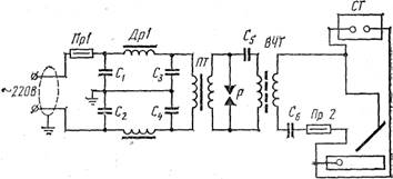 СТ — зварювальний трансформатор, Пр1, Пр2 — запобіжники, Др1|, Др2 — дроселі, С1 — С6 — конденсатори, ПТ — трансформатор, що підвищує, ВЧТ — високочастотний трансформатор, P — розрядник