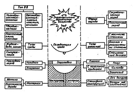 На рис.3 показана классификация ВВ, передающих сред, заготовок и матриц, применяемых при гидровзрывной штамповке, в основу которой положены четыре элемента, характерные для любого вида листовой штамповки.