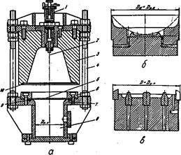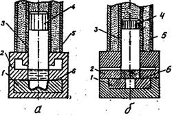 В двух следующих схемах энергоносителем является сжатый газ. Схема процесса ударной штамповки, в котором в качестве передающей среды используется жидкость, показана на рис.16, а. На матрицу 1 установлена камера 2, внутренний объем которой заполнен водой. На камере крепится ствол 3 гидроударного пресса так, чтобы внутренние диаметры ствола и матрицы совпадали. Внутри ствола перемещается боек 4. Соосно стволу расположен аккумулятор 5, в котором размещен сжатый газ. Заготовка 6 уложена на матрице и прижимается сверху камерой.