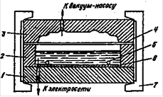 Технологический узел установки включает в себя основание о двумя вертикальными направляющими, гидросистему, систему вакуумирования и рабочую камеру. При опускании камеры в конечное положение включаются два гидроцилиндра, которые поворачивают стопорные гайки в горизонтальном направлении, жестко фиксируя камеру, заготовку и матрицу.