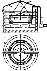 Жидкость по трубопроводу 9 поступает в рабочую камеру 10. Излишки жидкости сливаются в сборник 2, а оттуда стекают в резервуар 1.