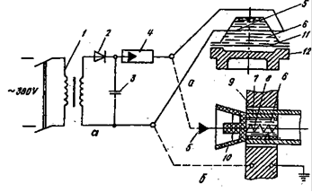 Основными элементами установок для магнитно-импульсной обработки металлов являются трансформатор, высоковольтный выпрямитель, конденсаторная батарея и технологический блок, включающий рабочий индуктор и матрицу либо оправку. Принципиальная схема установки показана на рис.13.