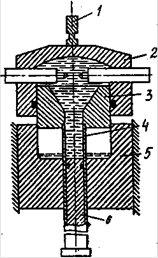Принципиальная схема ударной штамповки при помощи пресс-пушки, использующей энергию пороховых газов, показана на рис.15. В верхней части ствола 3 расположен патрон 1 и боек 2. В нижней части над заготовкой 4 возвышается столб жидкости 5. При срабатывании патрона пороховые газы разгоняют боек до определенной скорости и бьют им по жидкости, создавая мощный импульс давления" который деформирует заготовку.