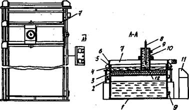 Установка состоит из технологического узла, генератора импульсов тока, системы подачи воды, устройства подачи инициирующей проволочки в зону разряда и пульта управления. На рис.12 показана схема этого технологического узла (соответственно вид в плане и поперечный разрез). Технологический узел содержит основание 1, служащее одновременно резервуаром для жидкости и местом укладки матрицы 3. На матрице размещена заготовка 5, которая по периметру прижата рамой 6. На последней смонтированы направляющие 4 и 7 для перемещения рабочей камеры 10 соответственно в продольном и поперечном направлениях. Движением рабочей камеры управляют с пульта 11.