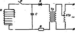 Рис.13. Принципиальная схема магнитно-импульсной установки: АТр - автотрансформатор; Тр - трансформатор; В - выпрямитель; С - конденсатор; Р - разрядник; U - индуктор; R - зарядное сопротивление