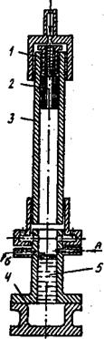 На установке "Удар-5" была применена схема, предусматривающая одновременно с внутренним радиальным давлением осевое сжатие цилиндрической заготовки. Как видно из рис.11, деформируемую заготовку 4 устанавливают в полости матрицы 5. Подвижной контейнер 3, связанный с рабочей камерой 2, вводят одним концом в матрицу и с помощью подвижного упора 1 перемещают до соприкосновения с торцом штампуемой заготовки. С другой стороны заготовки вводят заглушку 6.