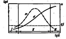 Рис.17. Схема условного разделения кривой сверхпластичности на три участка: I - m £ 0,3; II - 0,3 £ m £ mmax; III - m £ 0,3 (шкалы s и e - логарифмические; шкала m-линейная)