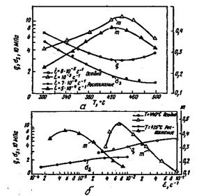 Рис.18. Зависимость напряжения течения сплава MA-1 при растяжении и осадке и коэффициента m от температуры испытания (а) и скорости деформации (б)