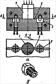 Рис. 20. Комбинированный процесс выдавливание - штамповка: а - штампы; б - готовая деталь
