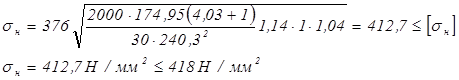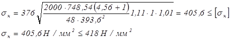 За расчётное допускаемое напряжение принимаем меньшее из двух допускаемых контактных напряжений [σн ]=418 Н/мм2 .