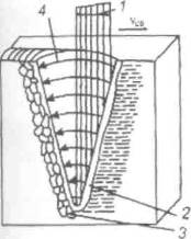 Рис. 1. Схема переноса жидкого металла при электронно-лучевой сварке: 1-электронный луч; 2 – передняя стенка кратера; 3 – зона кристаллизации; 4 – путь движения жидкого металла