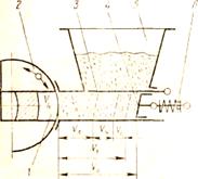 1 — мерная камера; 2 – делительная головка; 3 — заслонка; 4 — нагнетающий поршень; 5 — приемная воронка; 6 — стабилизатор давления.