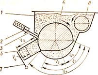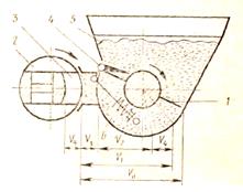 1— нагнетающая лопасть; 2 — делительная головка; 3 — мерная камера; 4— отсекающая демпфирующая заслонка; 5 — приемная воронка;