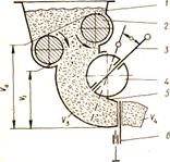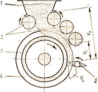 1 — приемная воронка; 2 — нагнетающие валки; 3 — формующий барабан;4— реборда барабана; 5 — отсекающий нож.