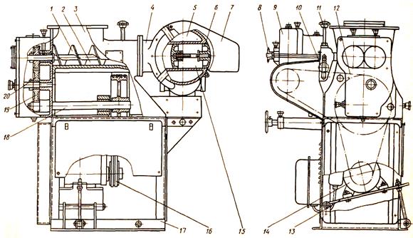 Тестоделительная машина ХДФ-М2 Машина ХДФ-М2 выпускается киевским заводом «Хлебмаш» (Рис. 14). Она предназначена для деления ржаного и ржано-пшеничного теста на заготовки массой 0,7—1,25 кг и состоит из приемной воронки 3 , примыкающей к рабочей камере 2, в которой размещено два нагнетающих шнека 1. Рабочая камера соединена с горловиной 4, к цилиндрической проточке которой примыкает барабанная делительная головка 5. В диаметральной цилиндрической проточке 15 головки размещено два плавающих поршня 6. Сверху головка закреплена откидным ограждающим щитком 7. Приводной электродвигатель 14 расположен на шарнирно закреплённой площадке 13, находящейся в нижней части станины 17. С помощью клиноременной передачи 16 электродвигатель соединен с промежуточным валом 18. С него движение с помощью шестерен 19 и 20 сообщается шнекам 1, а клиновым ремнем 12 — валу червячного редуктора 9. Последний через мальтийский крест сообщает периодическое движение делительному барабану. Натяжение ремня 12 осуществляется роликом 10 с винтовым фиксатором 11.