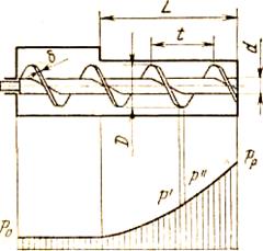 Рис. 16 Схема шнекового нагнетателя и эпюра давления:
