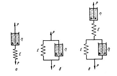 Помимо модели Максвелла (рисунок 1,а), состоящей из последовательно соединенных элементов: упругого Е и вязкого η, для описания процессов ползучести используют модель Кельвина-Фойгта (рисунок 1,б), состоящую из параллельно соединенных элементов Е и η, а также комбинации моделей Кельвина-Фойгта, Максвелла и упругих элементов. Так, при описании ползучести и релаксации, согласно комбинированной гипотезе ползучести, предложенной Е. А. Хейном, использована модель рисунок 1,в. Она состоит из звена Максвелла, описывающего необратимую ползучесть, и совокупности звеньев Кельвина-Фойгта, моделирующих упругое последействие.