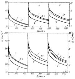 Для примера приведем аустенитную жаропрочную сталь Х15Н25В4Т (ЭИ164). В процессе испытания на релаксацию при 680—700°С в структуре предварительно закаленной и отпущенной при 750° С стали непрерывно происходит дополнительное образование вторичных фаз (в основном Ni3 Тi). Поскольку частицы этого интерметаллида при указанной температуре выделяются из твердого раствора в достаточно дисперсном виде, они тормозят процесс релаксации и первичные кривые (рисунок 21,а) отражают монотонный спад напряжения.