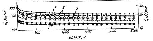 Положительное влияние ТМО может быть показана на примере низколегированной стали 35ГС, исследованной в работе. ВТМО заключалась в деформировании на 30% при 900°С с последующими закалкой и отпуском; Испытание на релаксацию проводилось при комнатной температуре кольцевым методом, при достаточно высоких значениях начального напряжения: 950, 1200, 1400 и 1600 МН/м2 (95, 120, 140, 160 кг/мм2 ). Как видно из рисунка 19, падение напряжения у образцов, подвергнутых ВТМО, меньше, чем у закаленных и отпущенных образцов. Эта закономерность справедлива как для начального периода релаксации, так и по истечении 200—400 ч.