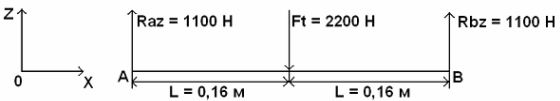 Б) Чертим схему вала в горизонтальной плоскости XOZ и определим составляющие реакции в этой плоскости.