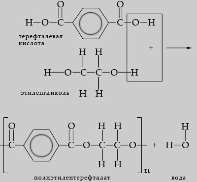 Рис.1.1 Реакция поликонденсации терефталевой кислоты и этиленгликоля при получении ПЭТ.