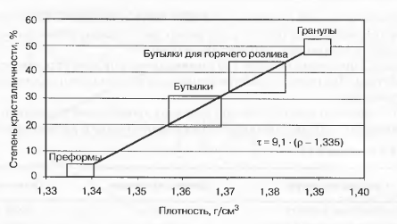 ПЭТ - частично кристаллический полимер с уровнем кристаллизации до 50 %. Кристаллизация — это расположение молекулярной цепочки в правильной геометрической зависимости. Плотность ПЭТ при комнатной температуре является мерой кристалличности (рис. 1.2).