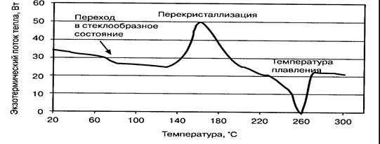 Кристаллизация ПЭТ является результатом воздействия высоких температур, которые выше температуры высокоэластичности ПЭТ. Однако часто этот диапазон температур может перекрываться в зависимости от сорта полимера, делая процесс более деликатным, - материал может начать кристаллизоваться во время повторного нагрева до достижения температуры высокоэластичности. Максимальная скорость кристаллизации достигается обычно при температуре около 160 °С. Этот экзотермический процесс можно наблюдать на дифференциальной калориметрической кривой (рис. 1.2). Он необратим, если материал переходит в область температуры плавления.