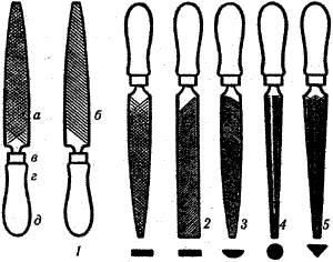 1 – плоский остроконечный (а – двойная насечка; б – одинарная насечка; в – кольцо; г – хвостовик; д – ручка); 2 – плоский тупоносый; 3 – полукруглый; 4 – круглый; 5 – трехгранный