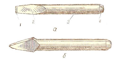 а- зубило; б- крейцмейсель; 1- лезвие; 2- рабочая часть; 3- средняя часть; 4- ударная часть ( головка );